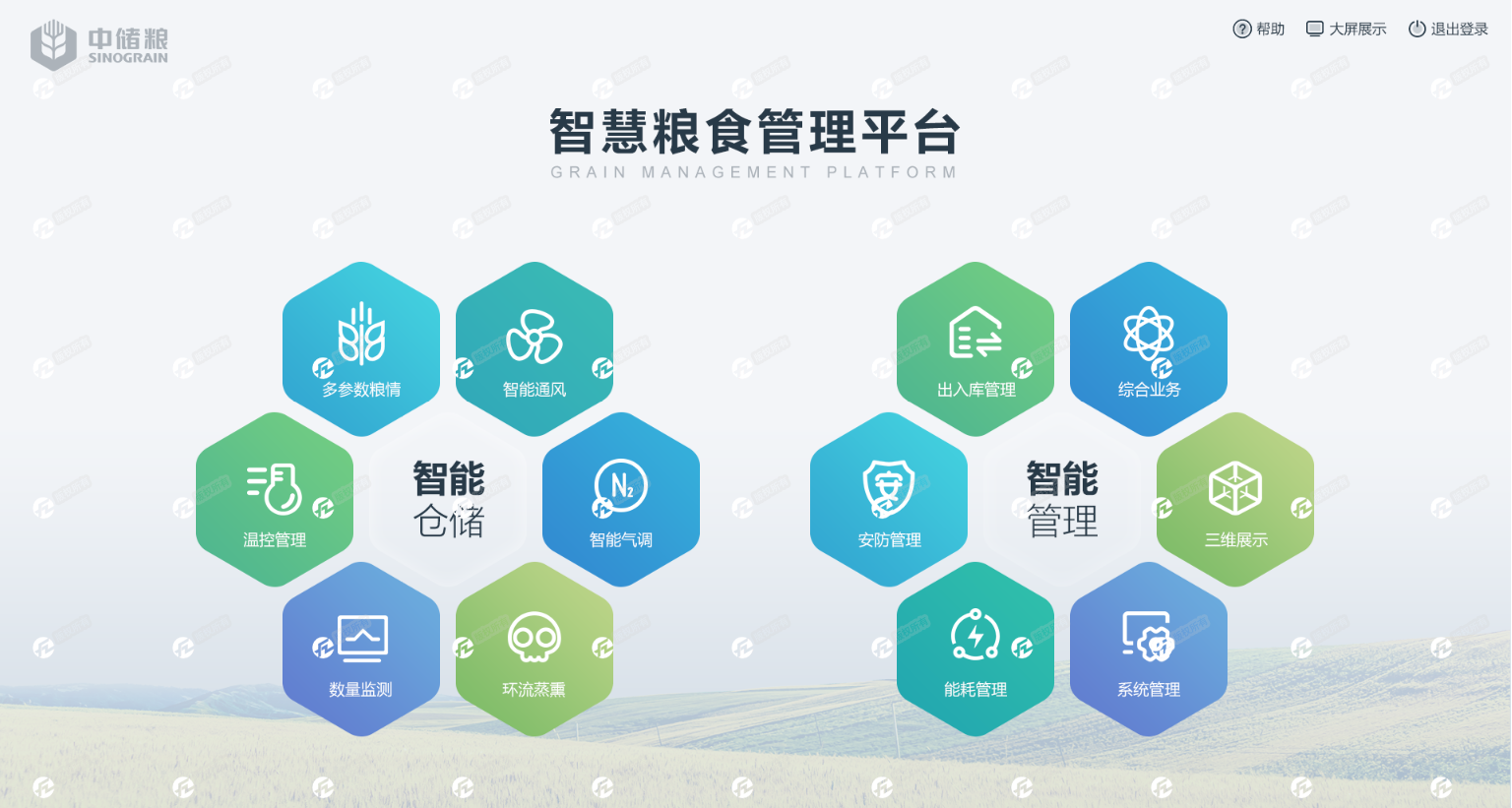 软件功能主要包括:三维可视化管理、气体管理、粮情管理、通风控制、气调控制、出入库管理、综合业务管理等